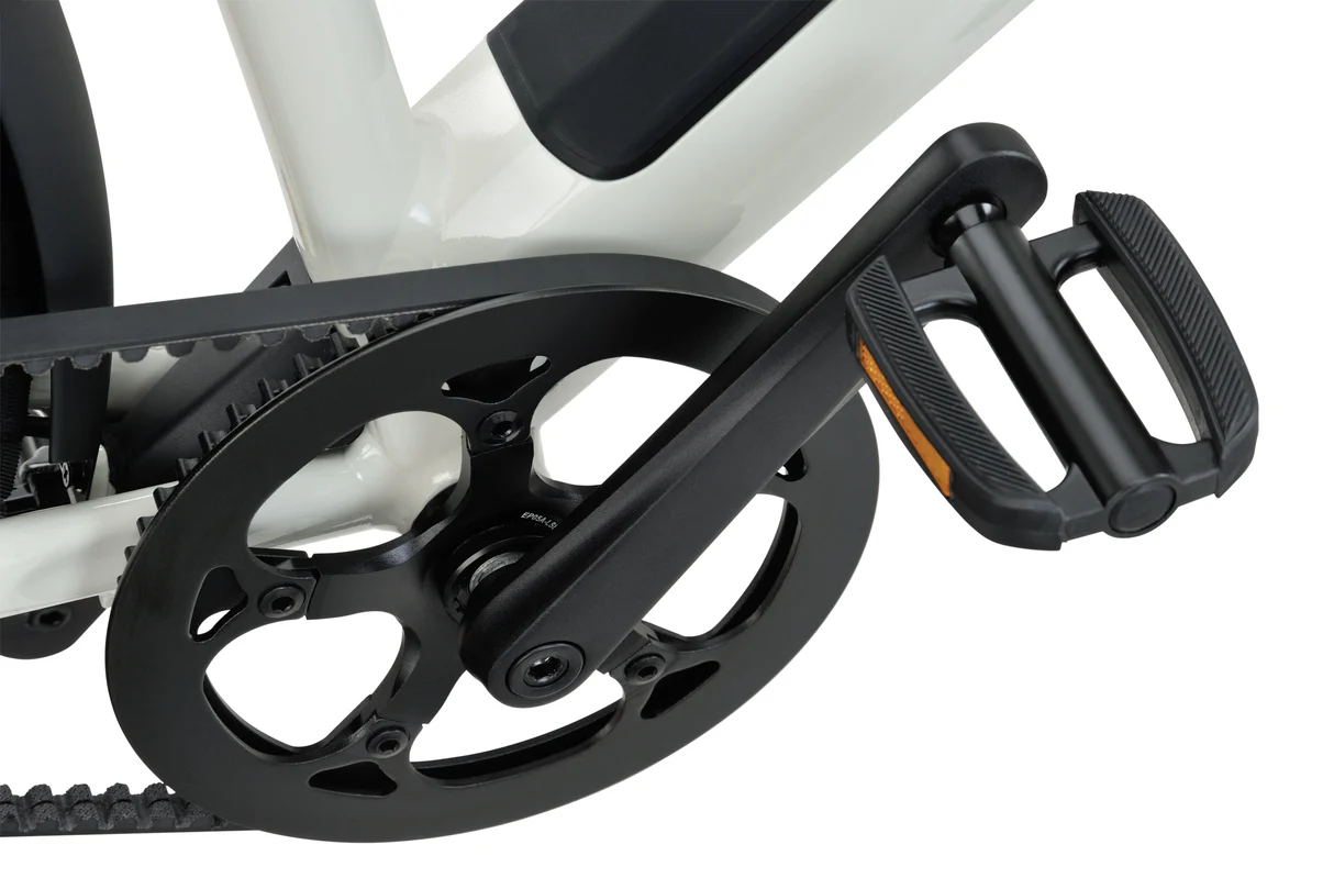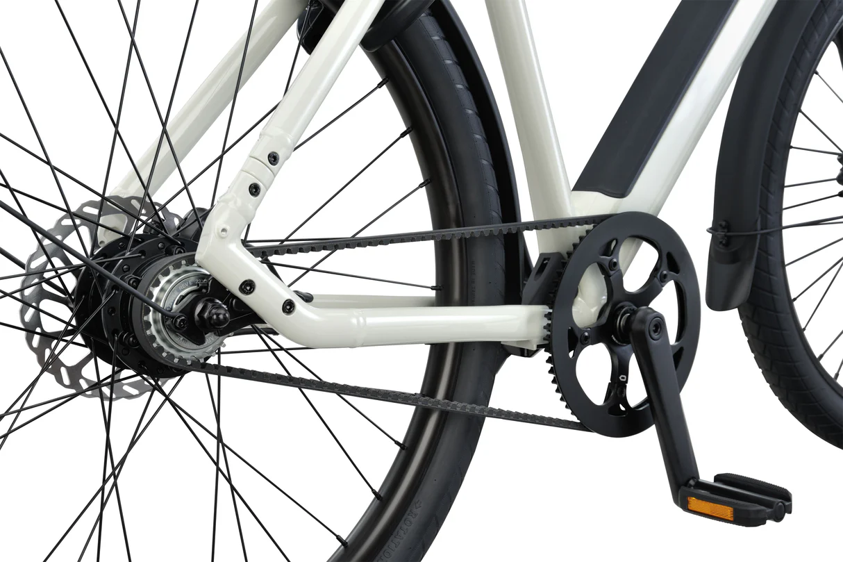 Motor y batería : Equipada con un silencioso motor de buje trasero Mivice de 250 W y una batería extraíble de 360 Wh, la Raleigh ONE ofrece una autonomía de hasta 80 km. La batería se puede cargar en la bicicleta o por separado, con una función de carga rápida que alcanza el 50 % en tan solo 1 hora. Transmisión : La transmisión por correa de carbono de Gates proporciona una conducción suave, silenciosa y de bajo mantenimiento, ideal para el uso diario sin las complicaciones de una cadena tradicional.